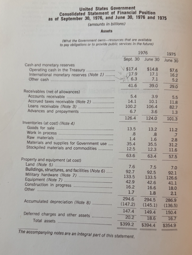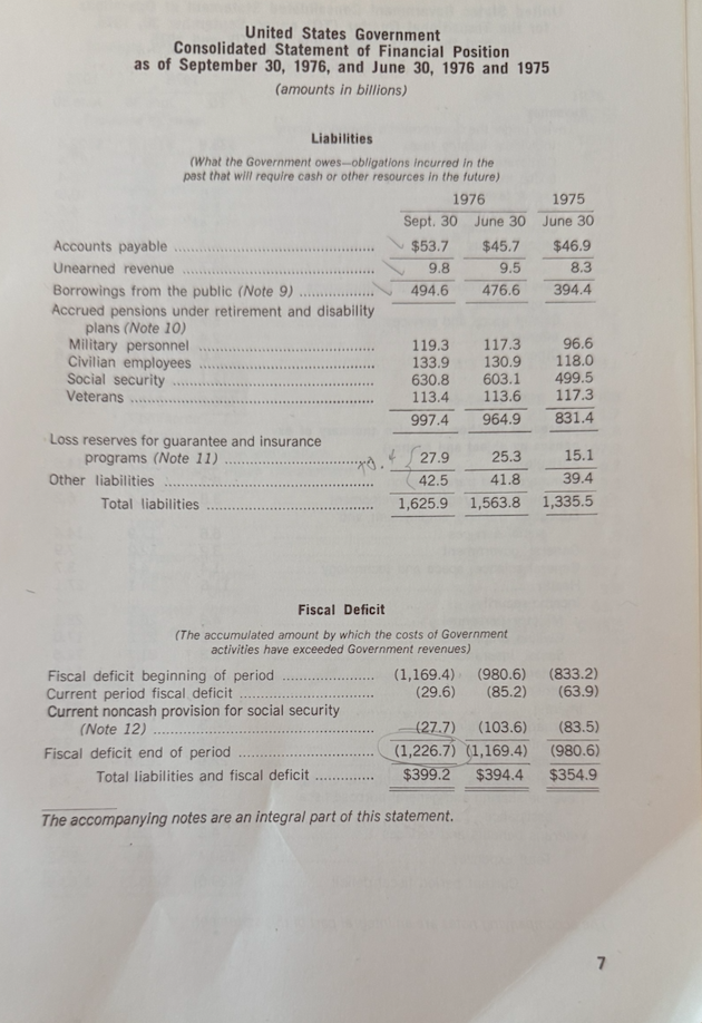 Fortunately, I do have a copy of the second report. Like the first, it is labeled a “prototype.” It reports on the financial condition of our government in 1976 and 1975. It lists $399.2 billion in assets and $1,625.9 billion in liabilities. That leaves a negative net worth of $1,226.7 billion. You can see the basic pages below.